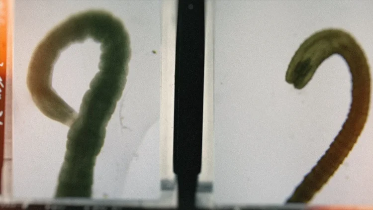 As the sequence escalates, we employ off-kilter cropping, duplication and frenetic jump-cuts, warping beauty into grotesquerie. The images are manipulated beyond recognition, focusing intently on the horrific, interspersed with graphic ultrasound scans of parasitic tapeworms and rampant binge eating.