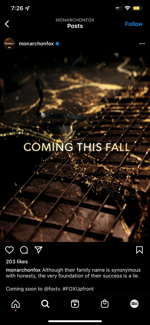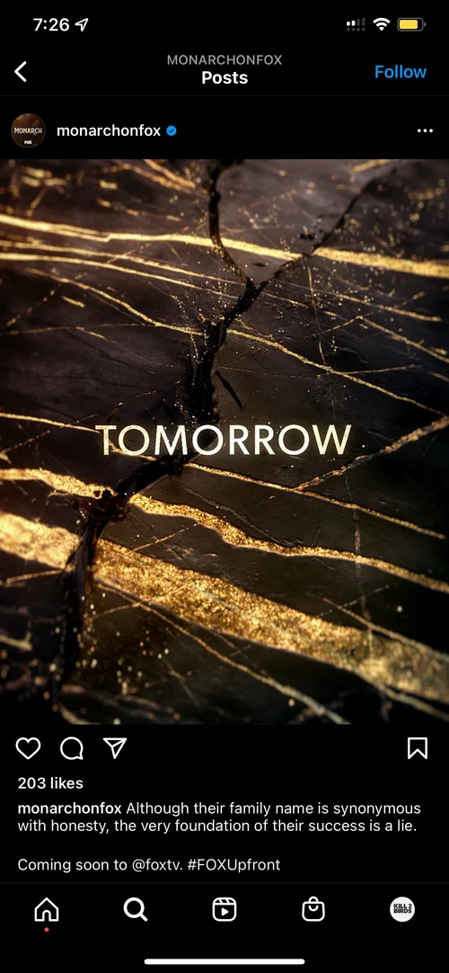 Kill 2 Birds created a textural, glittery promo package for ‘Monarch’ that leans into both the family prestige and the hidden drama lurking beneath the surface. The design utilizes detailed surfaces and music iconography [microphones, guitars, picks] made from beautiful black marble with shimmering gold veins — each fracturing at key moments in their respective animations. With each fracture, reflective gold dust particles explode out toward camera, adding a nice touch of depth within each scene.