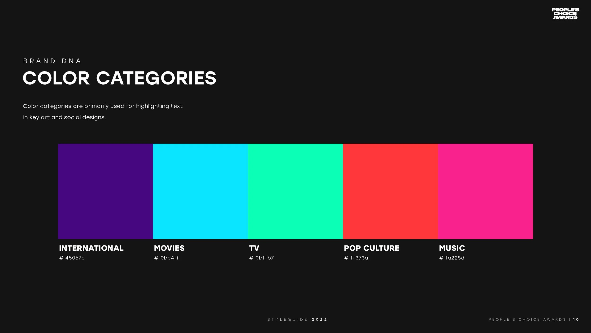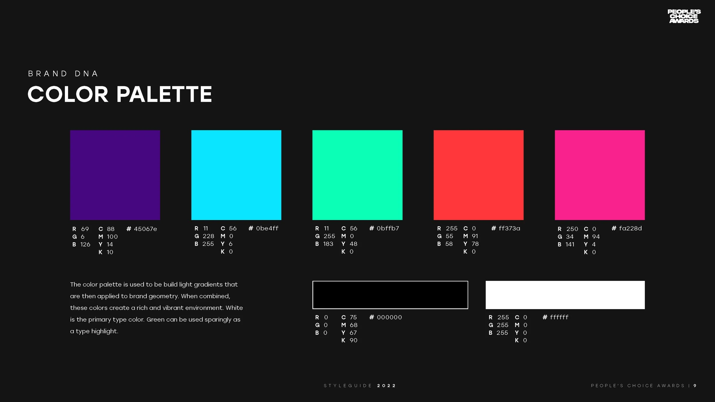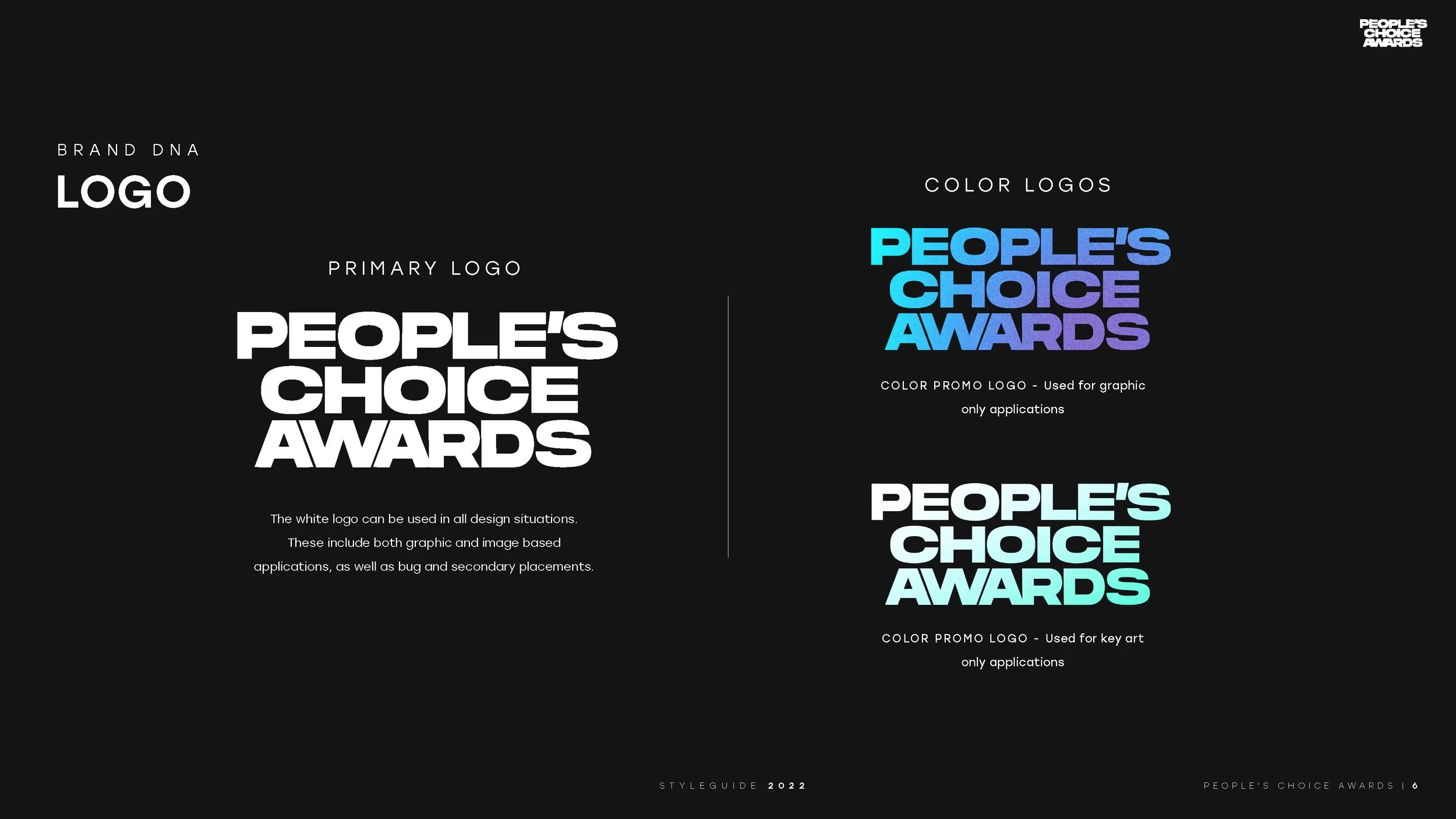 The K2B design team created a conceptual platform featuring geometric forms bathed in vibrant, colorful light. The forms — sometimes repeating, sometimes singular — provided a deep modularity across the package. The People’s Choice Awards is one of Hollywood’s biggest parties and keeping that party continually fresh was critical.