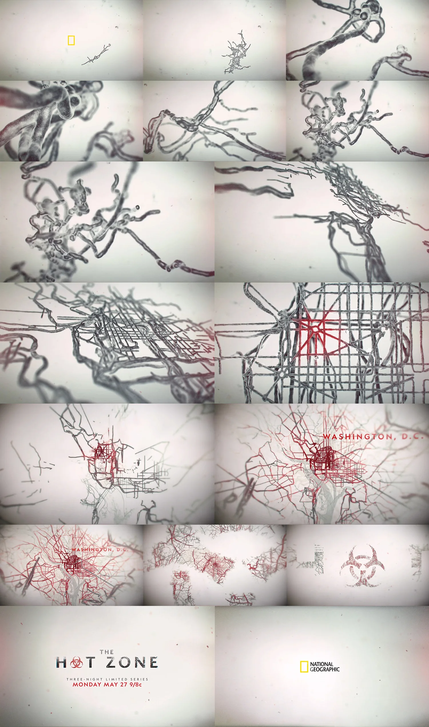 These tiny viral threads that connect remote African villages and the heart of Western Civilization live at the center of The Hot Zone, so we made them the series’ core visual motif.